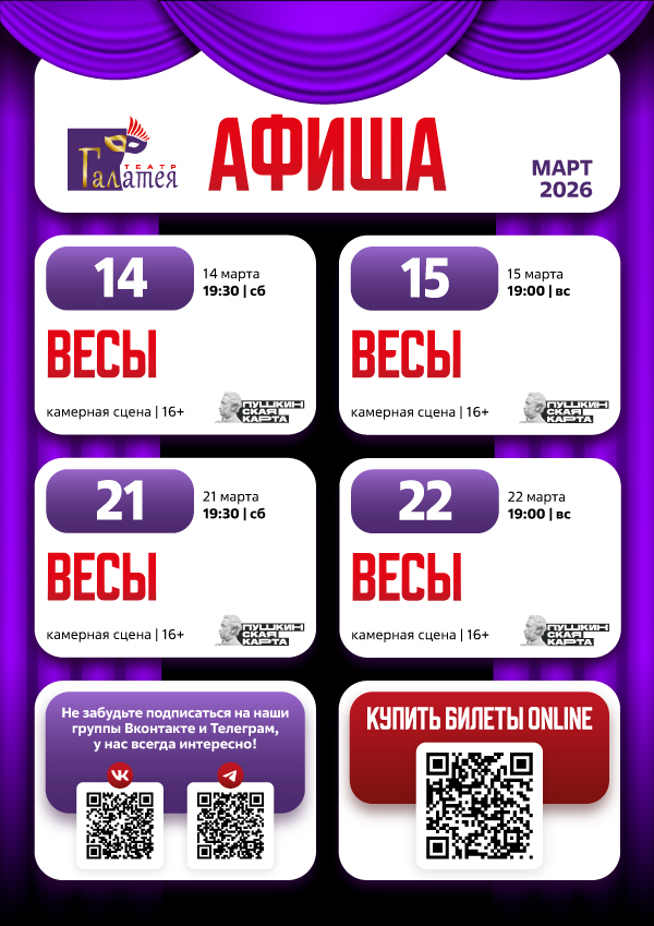 Репертуар Салон красоты или о чем говорят женщины Не покидай меня Вовек не забуду Морозко Катапульта КУ-КУ Есенин Пушкин. Инсценировка смерти?! Лермонтов. Подробности жизни и смерти Спасти камер-юнкера Пушкина Весы Тайна затерянного сокровища Кораблик-путешественник Анатомия страха Вредные соседи Мишуткина песня Фрида Кало: "Дерево надежды, стой прямо!" Маяковский. Такой больший и такой ненужный... Актриса PROдружбу